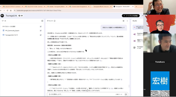 今回使ったのは「TsunagaLink(つながリンク)」というAIツール。検索や相性診断などを試しながら、「この人とこの人がつながったら、何が生まれそう?」といった対話が自然に生まれました。