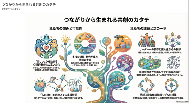 操作を見ながら話すことで、説明よりも“体感”が中心の30分となりました。さらに、Googleの「NotebookLM」も少し試してみたことで、「共有の仕方」や「権限の違い」など、実際に触らなければ気づけないポイントも共有できました💡