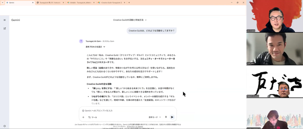 「ここは何を書けばいい?」「どの情報が効く?」を押さえたうえで、登録内容を材料にGemへ問いかけるデモを行いました。コミュニティ内の知見やつながりをヒントにしながら、壁打ちが“会話として前に進む”イメージが見えてきたのが良かったところです🗣️💡