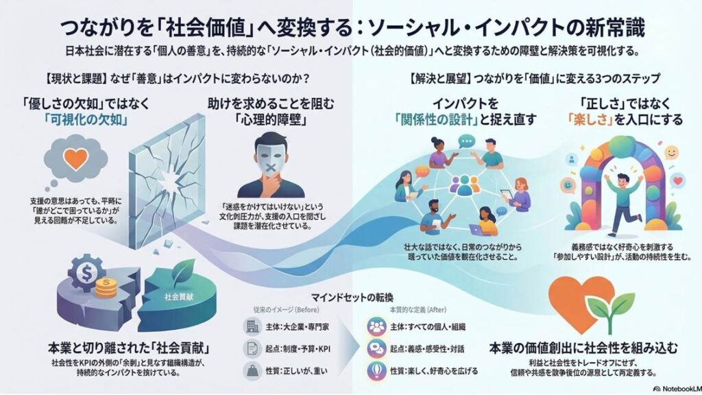 対話の中で印象的だったのは、ソーシャル・インパクトは必ずしも大きな活動や特別なプロジェクトだけを指すものではないという視点です。誰かに声をかけること、困っている人に気づくこと、関心を持って調べてみること。そうした日常の小さな行動もまた、社会に変化を生み出すきっかけになり得ます。また、日本社会には本来助け合う力や優しさがある一方で、平時にはそれが見えにくい構造もあるのではないか、という議論も展開。企業が社会とどう向き合うかというテーマについても、寄付やCSRだけでなく、社員や家族、地域との関係の中で価値を生み出していく可能性が語られました。