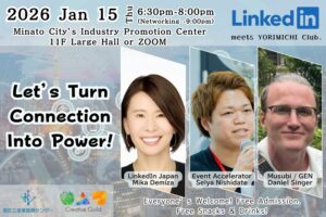Our guest speakers are three people who have turned connection into their work:Mika Demiza from LinkedIn Japan;Seiya Nishidate, an event accelerator and community manager at Uvance Innovation Studio (UIS), operated by Fujitsu;and Daniel Singer, who creates cultural and business exchange by connecting people from Japan and abroad.